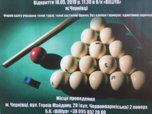 У суботу та неділю, 18-19.05.2019 р., у новому більярдному клубі по вул. Героїв Майдану, 29 (2 поверх, над «Нашим пивом»/Силует) – відкритий турнір з більярду з гарантованим призовим фондом 10 тис. грн. (а реально призовий фонд буде, напевно, більшим).